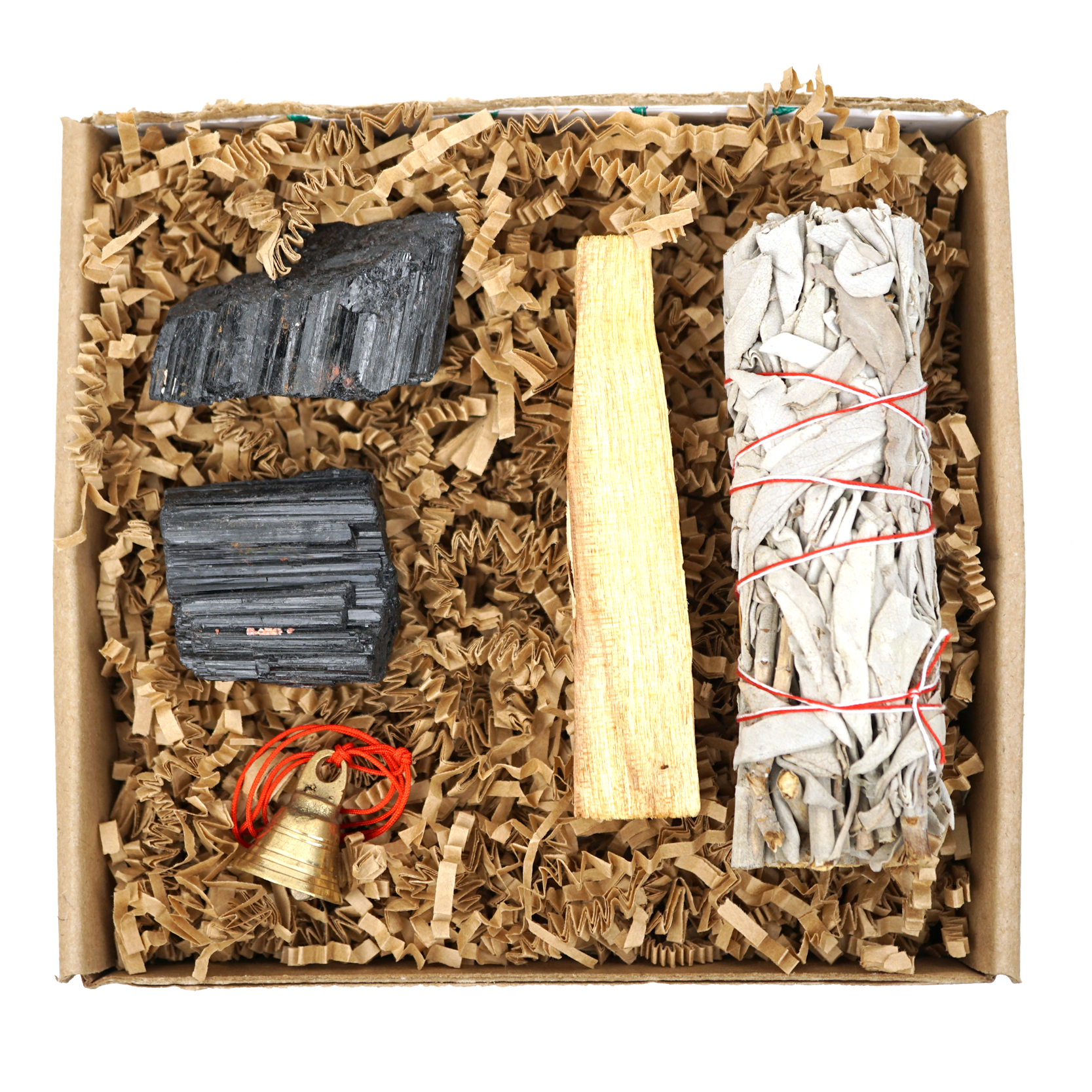 Black Tourmaline acts as an energy bodyguard to keep your home, and everyone in it, energetically safe and secure. Sage burns away any stagnant or low vibrational energy. Palo Santo brings joy and blessings into your space. The bell breaks up negative energy as you enter and exit your home. The red string tied around the bell activates the protective energy of the bell.
