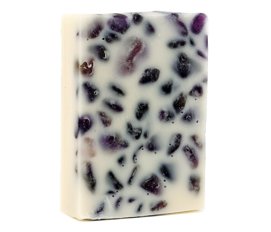 Ingredients: Deionized Water, Glycerin, Sorbitol, Sodium Cocoate, Sodium Stearate, Glycine Soja (Soybean) Oil, Prunus Amygdalus Dulcis (Sweet Almond) Oil, Carthamus Tinctorius (Safflower) Seed Oil, Simmondsia Chinensis (Jojoba) Seed Oil, Organic Aloe Barbadensis (Aloe Vera) Leaf Extract, Tocopheryl Acetate (Vitamin E Acetate), Titanium Dioxide, Lavandula angustifolia (Lavender) Essential Oil, Citrus aurantium L. var amara (petitgrain) Essential Oil, Amethyst